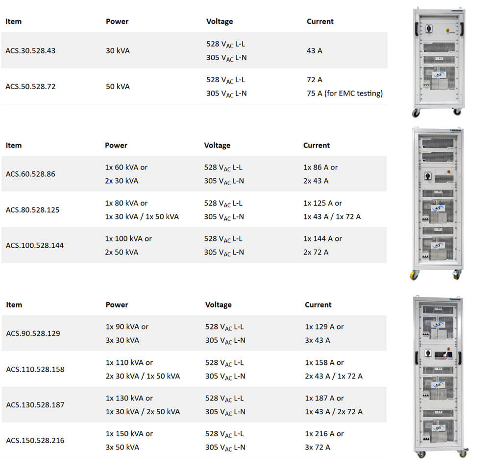 The versatile 4-Quadrant AC source TC.ACS with its exceptional programming functions covers a wide range of applications. The requirements with respect to the output power of the AC systems are therefore just as wide-ranging and vary according to the application, test purpose and test object. The latest firmware update now allows 30 kVA and 50 kVA TC.ACS modules to be connected in parallel in any configuration! For example, 80 kVA and 130 kVA systems can be created this way. Mixed mode operation of unequal power units can be used both for new systems and for the expansions of already installed systems.