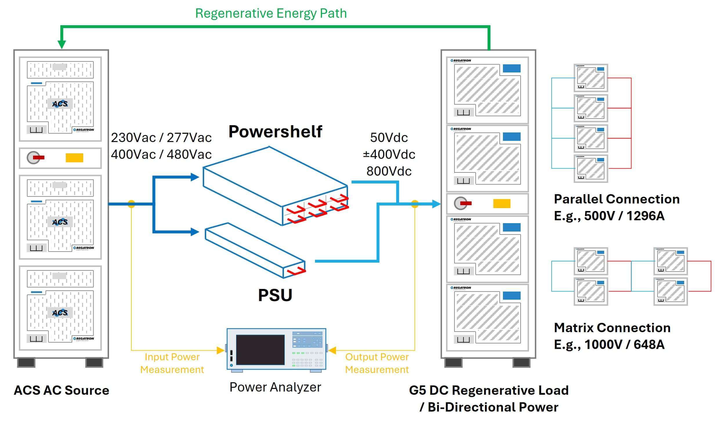 Setup for PSU / Power Shelf testing with a TC.ACS AC Grid Simulator and a G5.RSS regenerative DC load