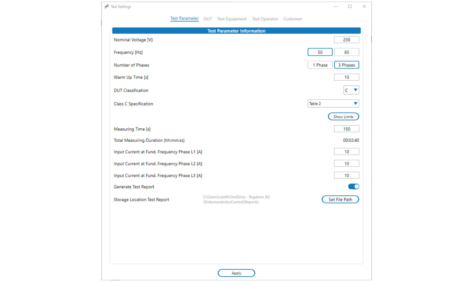The new Wizard for testing manually switched DUT’s in accordance with IEC/EN 61000-3-3 Annex B guides the operator step by step through the test procedure. In accordance with the definitions in the standard, voltage fluctuations and their duration are determined in 24 measurement sections. This eliminates the need for additional evaluation of short-term and long-term flicker. At the end of the test, the measured values are processed in accordance with the standard. The best and worst measured values are sorted out, the mean value for the evaluation is calculated from the remaining values and the test report is generated.