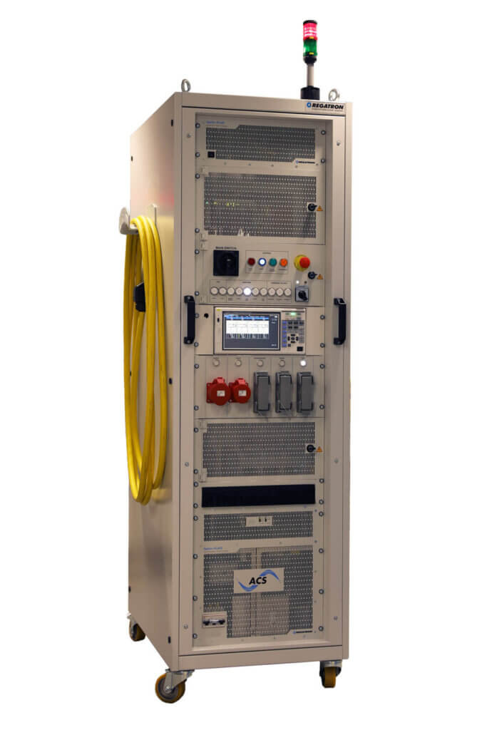The REGATRON Turnkey Concept is particularly effective for test equipment used with products sold internationally. The time saved by simply selecting the appropriate power socket is remarkable, as is the automatically correct mains voltage and frequency. See the following use cases of a OBC tester: