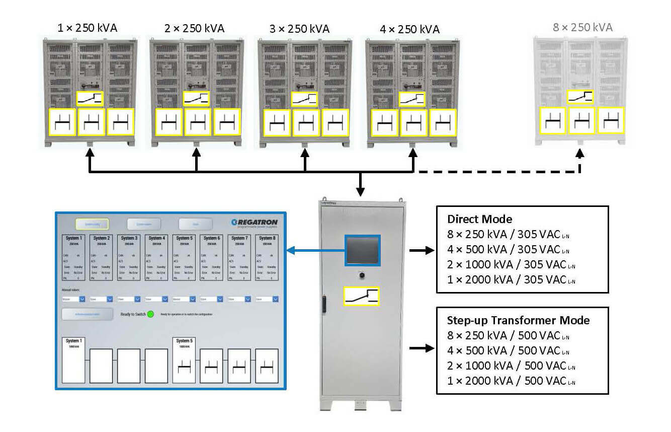 Up to eight 250 kVA power units for a total output of 2000 kVA can work together. The system concept enables also an output voltage range tailored to the application using ‘Direct Mode’ or ‘Step-up Transformer Mode’. In Direct Mode, the power units operate directly on the output terminals of the system and offer an output voltage range given by intermediate module voltages. In Step-up Transformer Mode, the output voltage range can be expanded by an appropriate transformer.